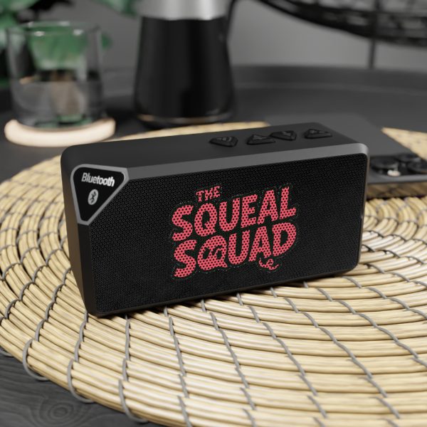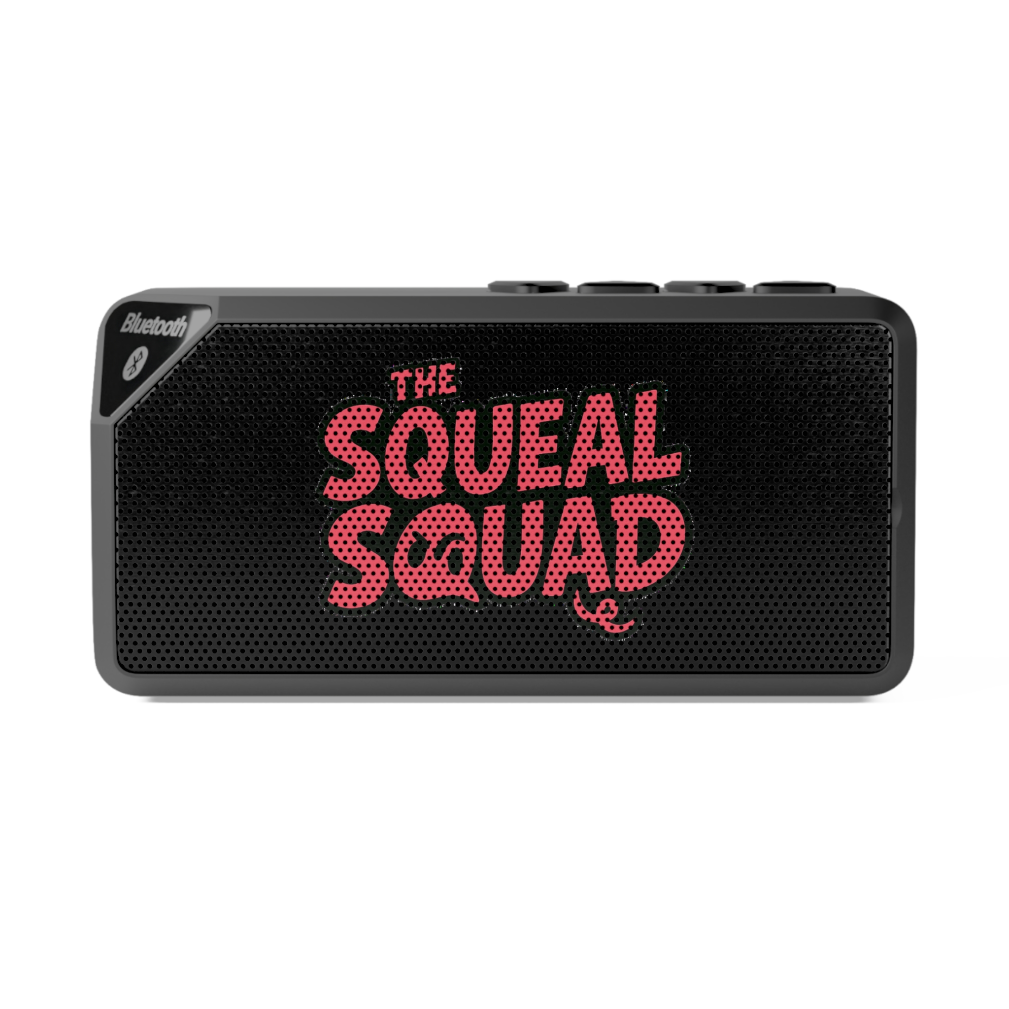 A compact Bluetooth speaker with attitude — bold graphic front, tactile buttons, and a durable ABS shell built to go wherever music is needed. The Squeal Squad design pops in bright ink against a matte black body, making this piece as much a statement as a sound source. Pair it wirelessly from up to 10 meters or plug in via the 3.5mm aux port. A built-in 3.7V/500mAh Li‑ion battery keeps tracks playing at high volume for around two hours, and the 3W output delivers surprisingly clear sound for small gatherings, desk sessions, or on-the-go playlists. Simple controls sit on top for play/pause and volume, while the rear panel houses the aux input, micro‑USB charging port, and battery compartment for easy access. Compact, portable, and designed to stand out — this speaker brings personality to everyday listening.