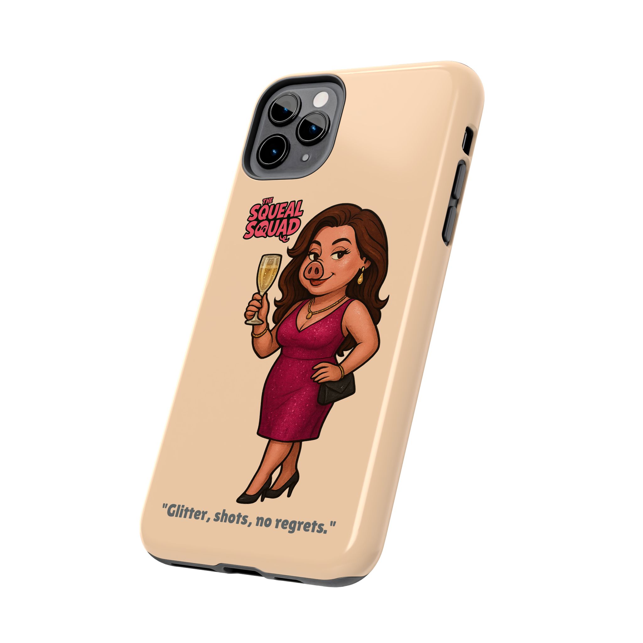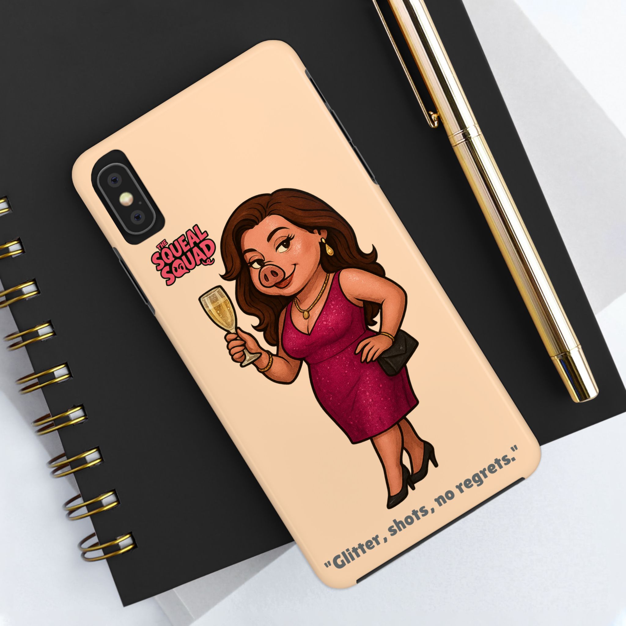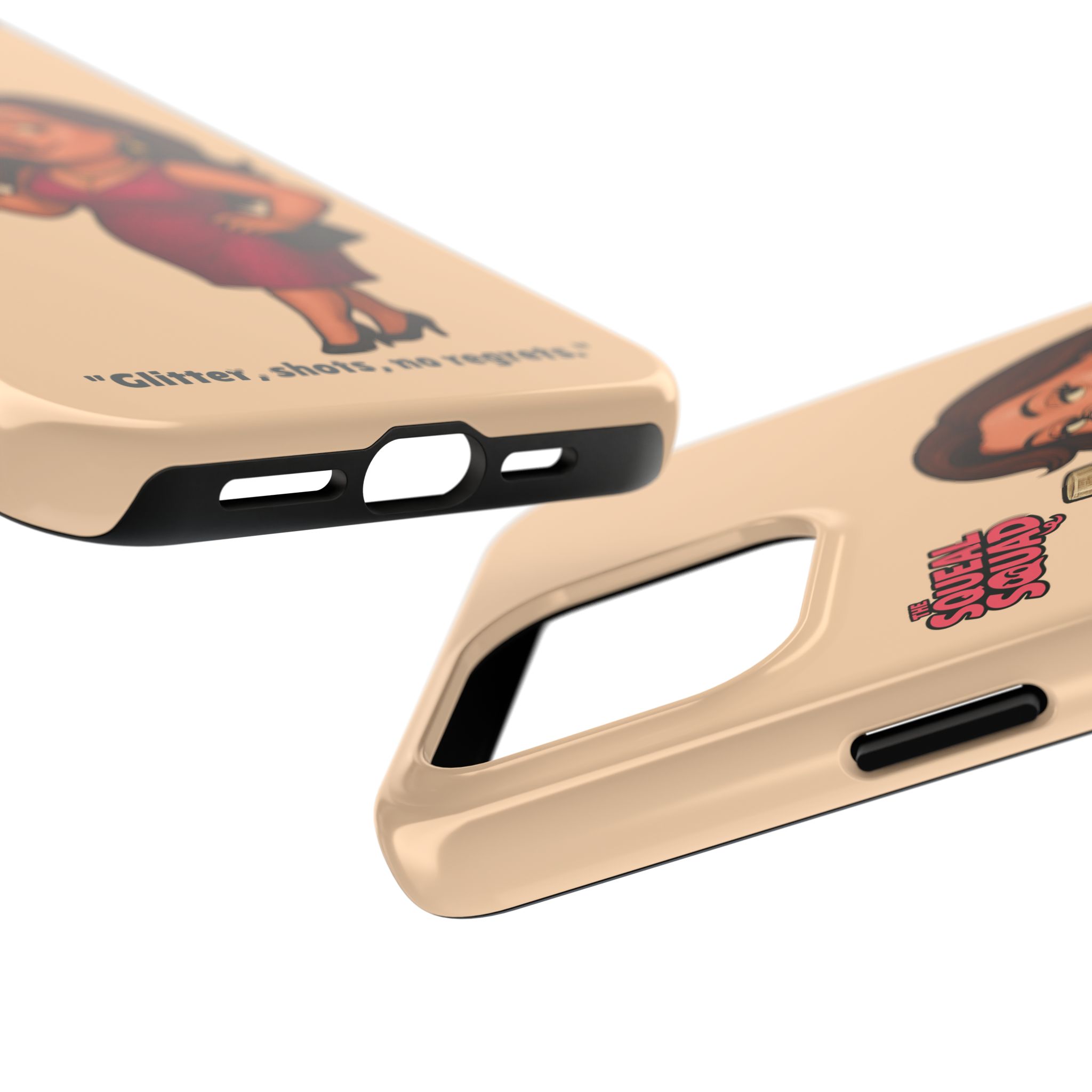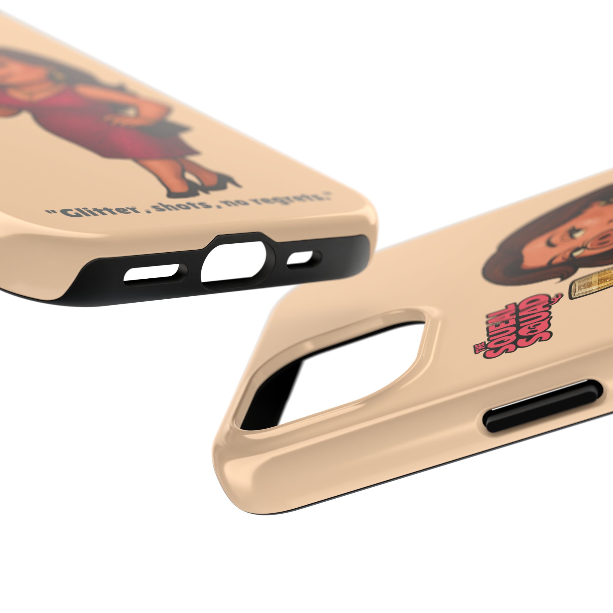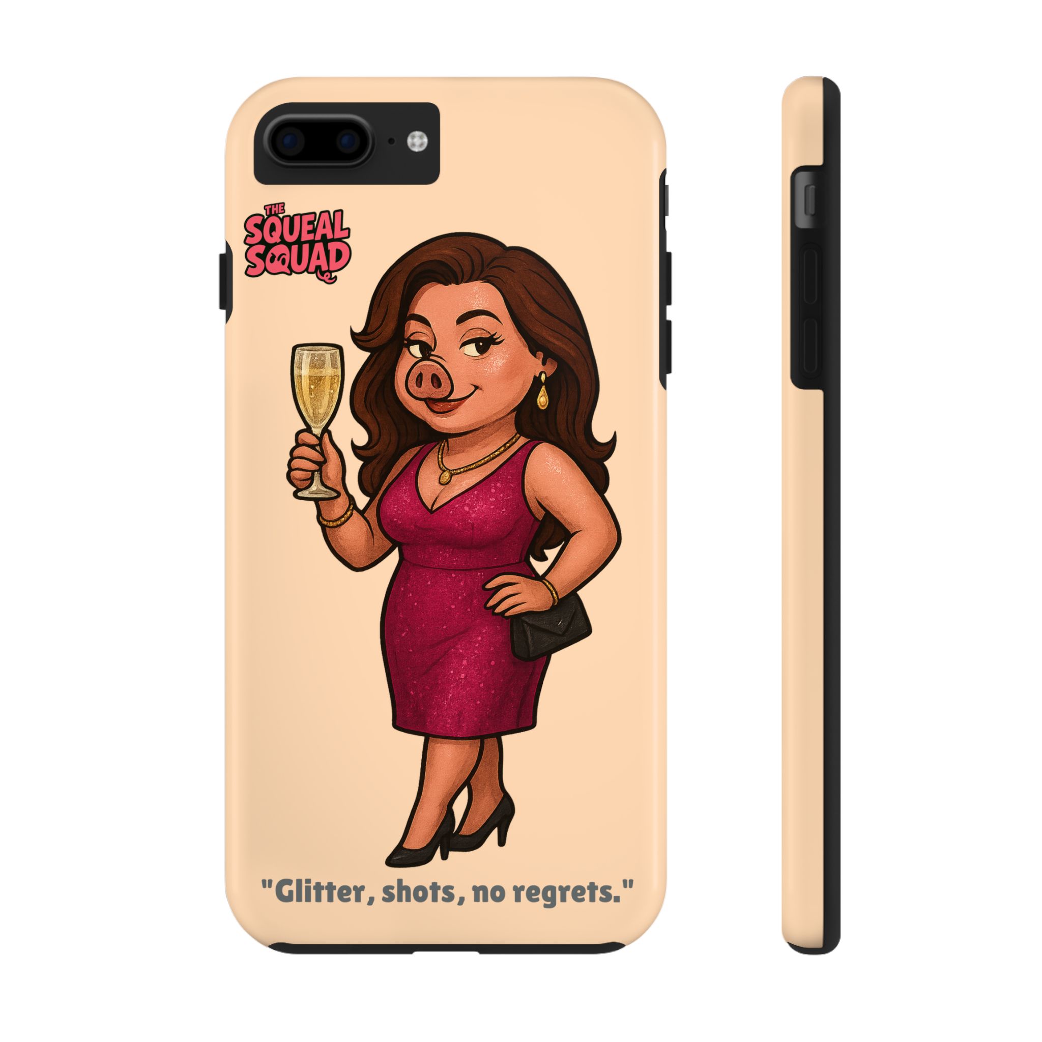 The Velvette Phone Case is all charm and control — just like The Squeal Squad’s queen of the nightlife. Designed for those who move through chaos with style, it protects your phone while turning every glance into a double-take. Sleek, durable, and a little bit dangerous — exactly how she likes it.
