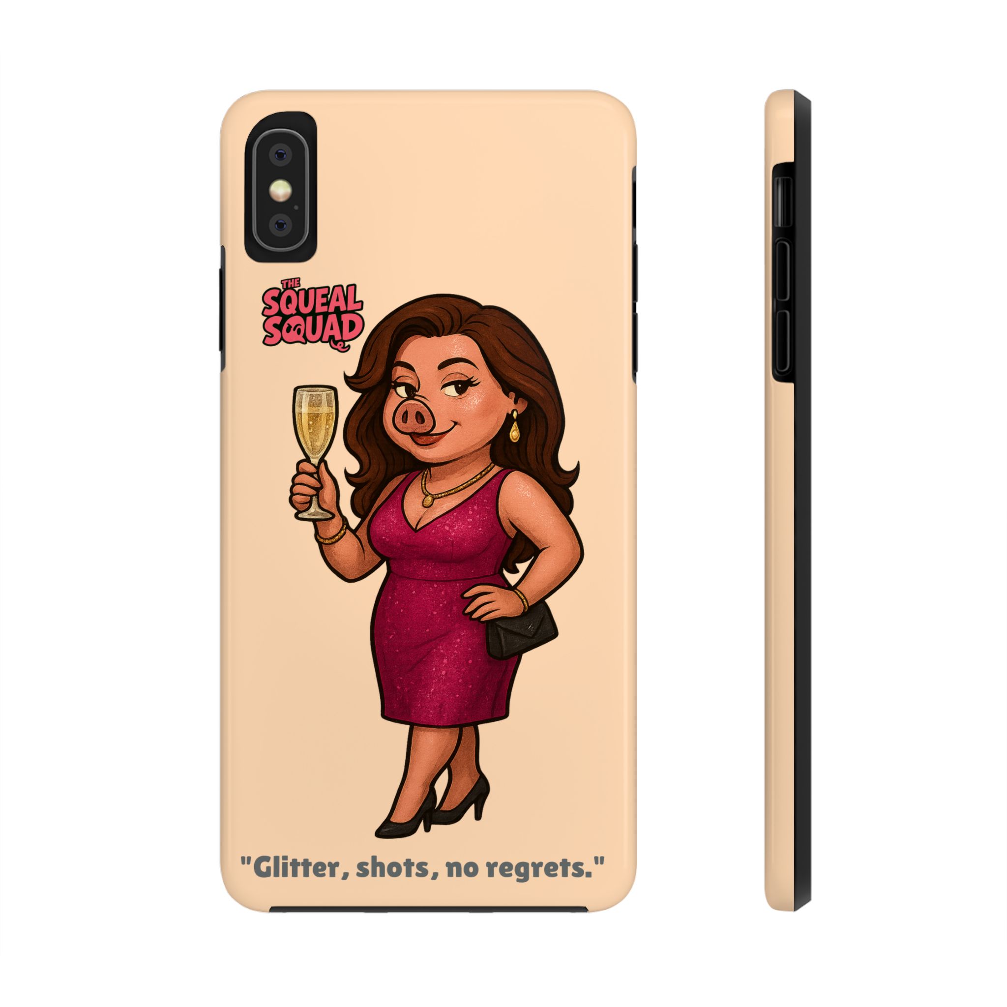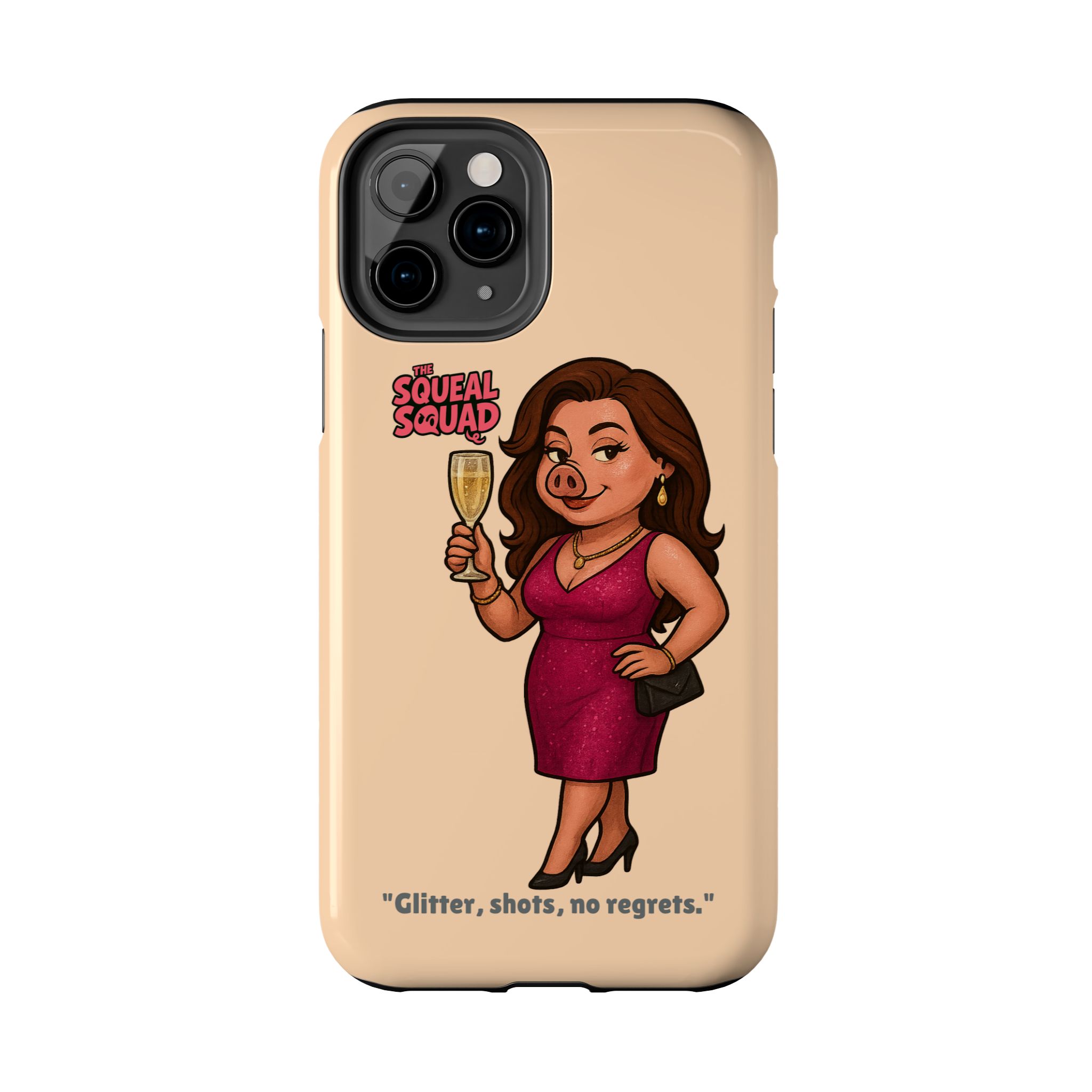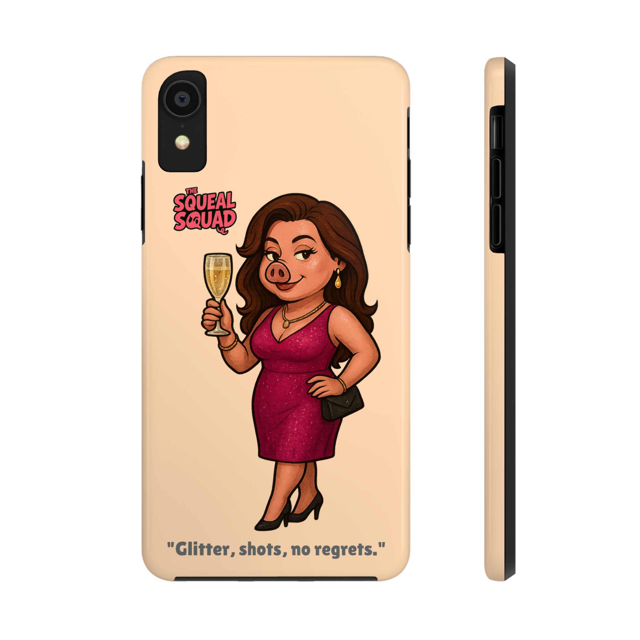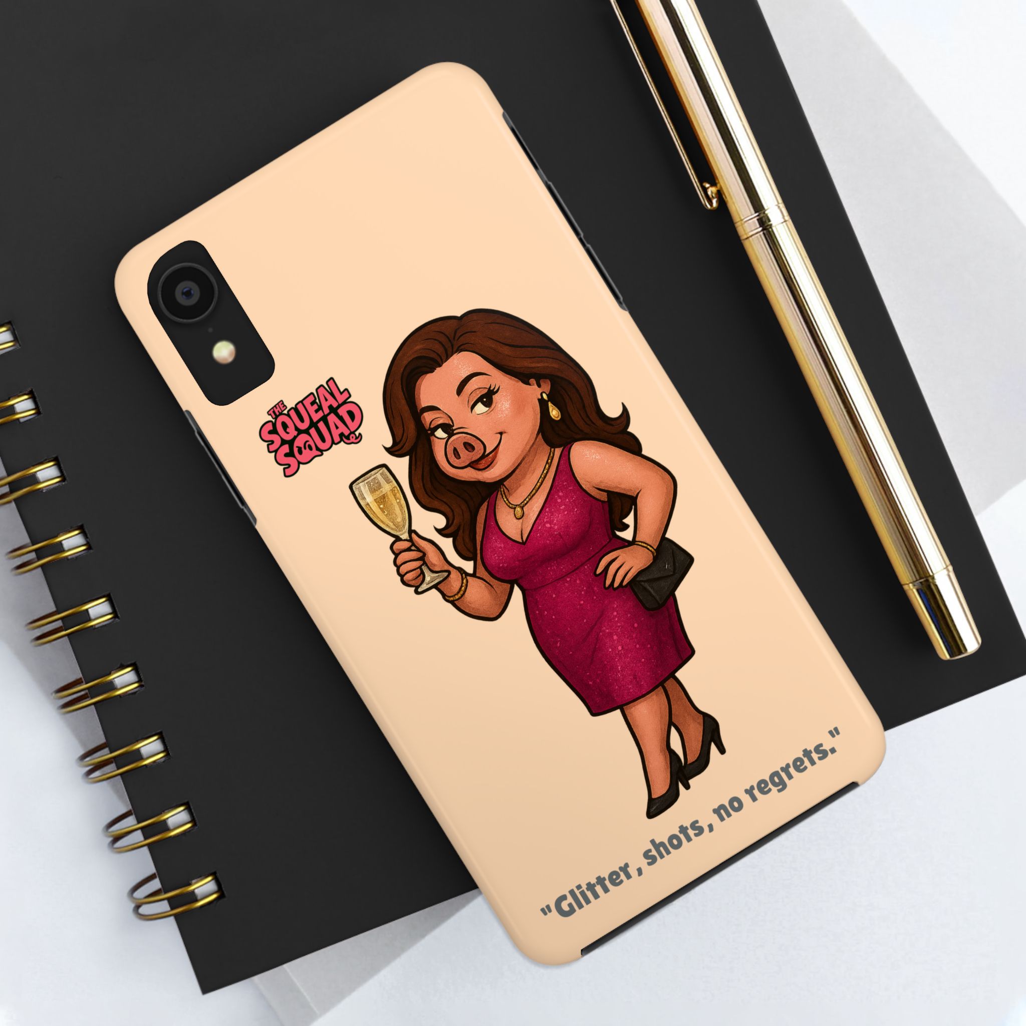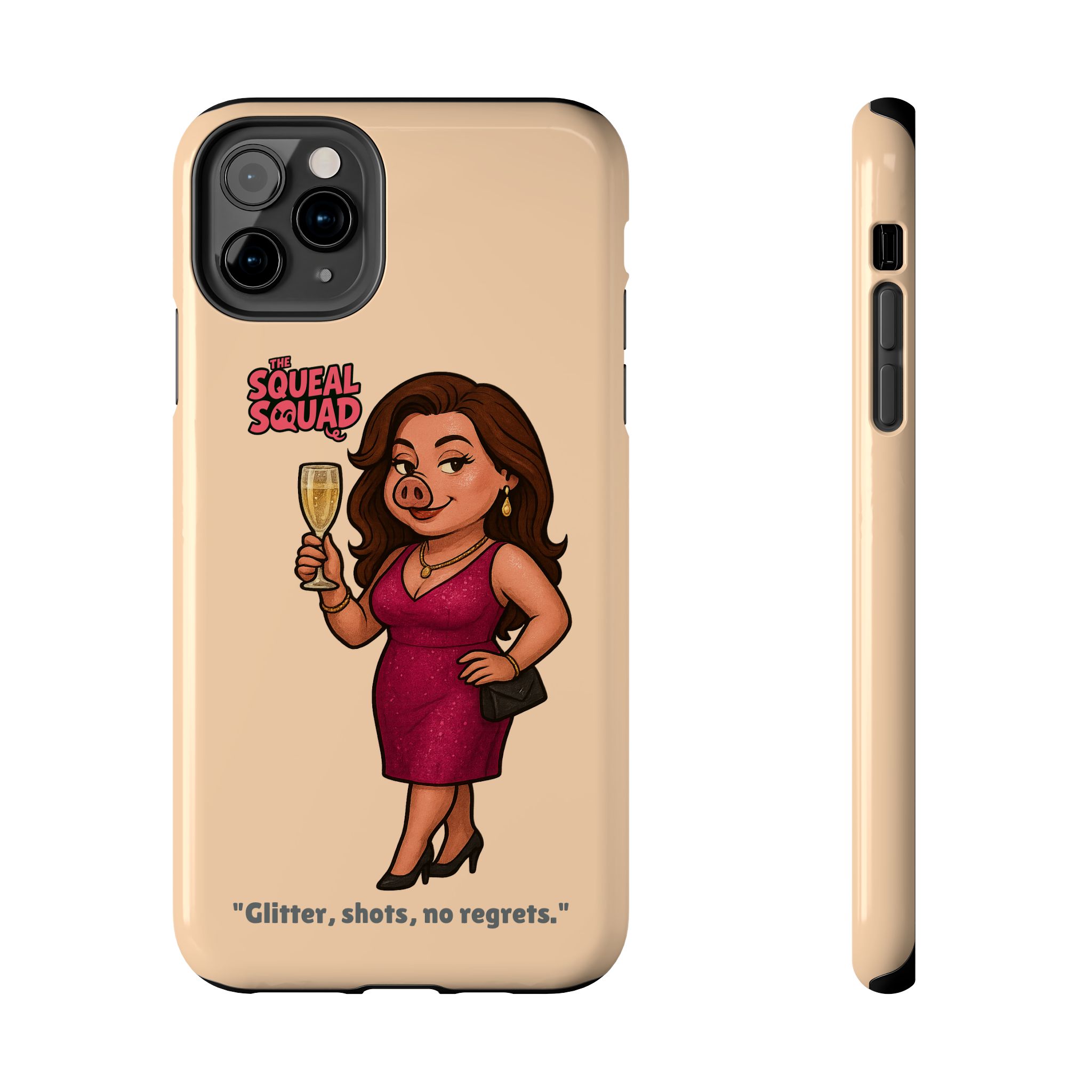 The Velvette Phone Case is all charm and control — just like The Squeal Squad’s queen of the nightlife. Designed for those who move through chaos with style, it protects your phone while turning every glance into a double-take. Sleek, durable, and a little bit dangerous — exactly how she likes it.